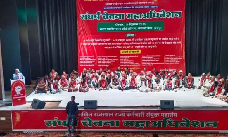 शिवगंज अखिल राजस्थान राज्य संयुक्त कर्मचारी महासंघ का भव्य संघर्ष चेतना महाअधिवेशन खंडेलवाल ऑडिटोरियम वैशाली नगर जयपुर में प्रदेश अध्यक्ष महावीर शर्मा की अध्यक्षता में विशाल कर्मचारी चेतना महाअधिवेशन में कर्मचारी नेताओं ने सर्वसम्मति मे 19 जनवरी को राजधानी जयपुर में चेतावनी रैली का ऐलान कर राज्य सरकार से आर पार के संघर्ष की चेतावनी से कर्मचारियों में जोश उफान पर देखा जा सकता है।